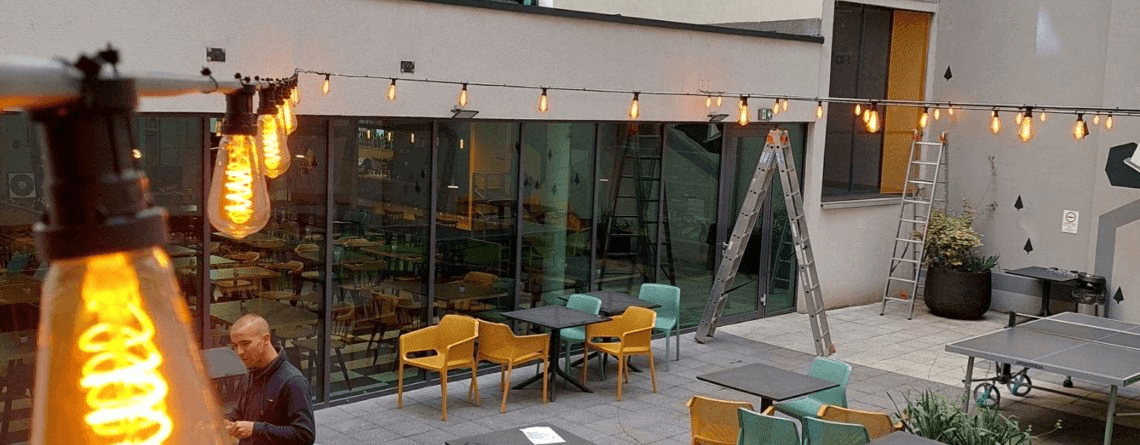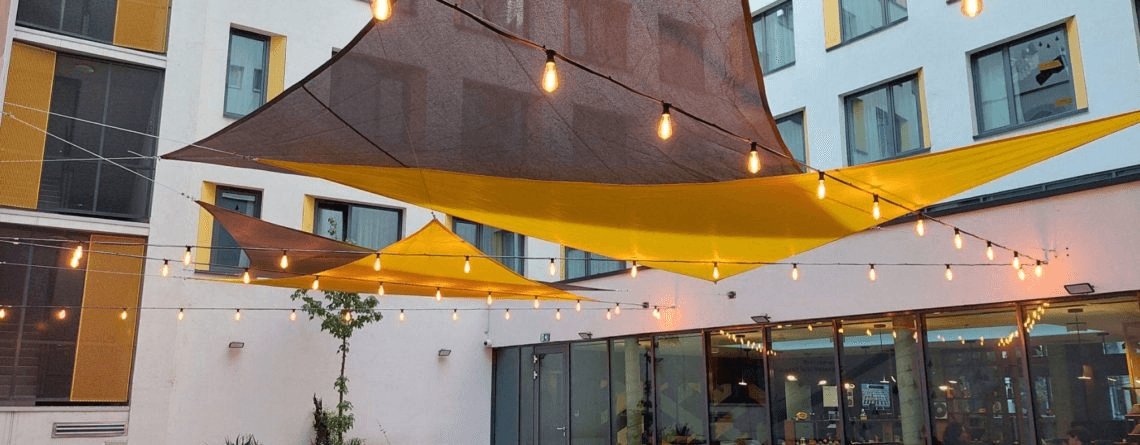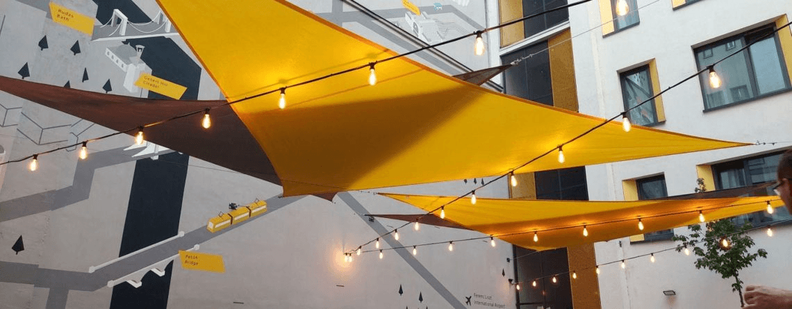 Egyik kiemelt projektjeink között tartjuk számon a D8 Hotelben kialakított árnyékolás és világítás telepítési munkánkat. A hotel udvarának stílusát tükröző modern, napvitorla központú árnyékolás és hozzátartozó dekor világítás kiépítésével kerestek meg minket.