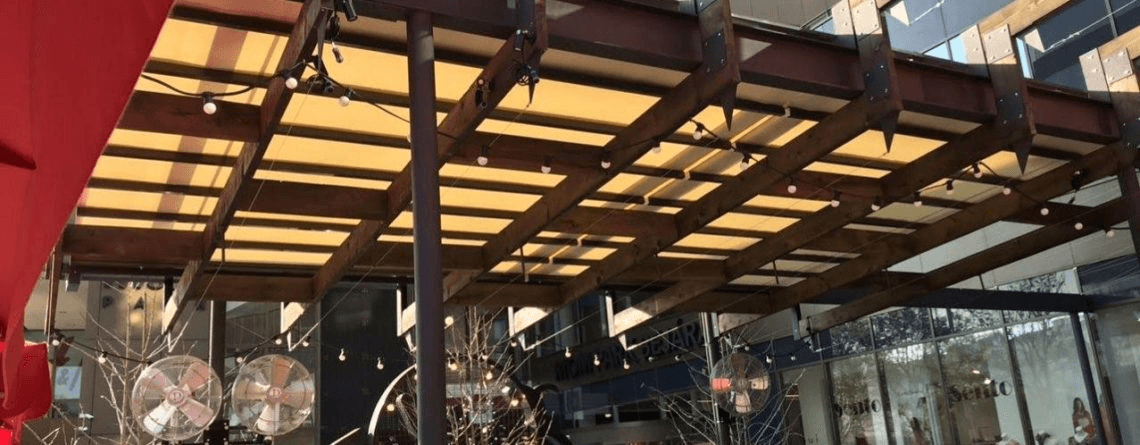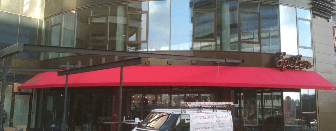 Különböző árnyékoló típusokból álló koncepciót kértek tőlünk, amely képes igazodni a helyszín szabálytalan formáihoz és a megrendelői igényekhez. Az első megoldandó feladat egy íves falfelületre szerelhető napellenző megtervezése és legyártása volt. Törekednünk kellett, arra hogy az általunk készített szerkezet minél diszkrétebben, de mégis a Spíler brandre jellemző eleganciával és esztétikummal töltse be funkcióját. A megoldás egy íves falfelülethez igazodó egyedi, fix napellenző szerkezet megalkotásában öltött testet.