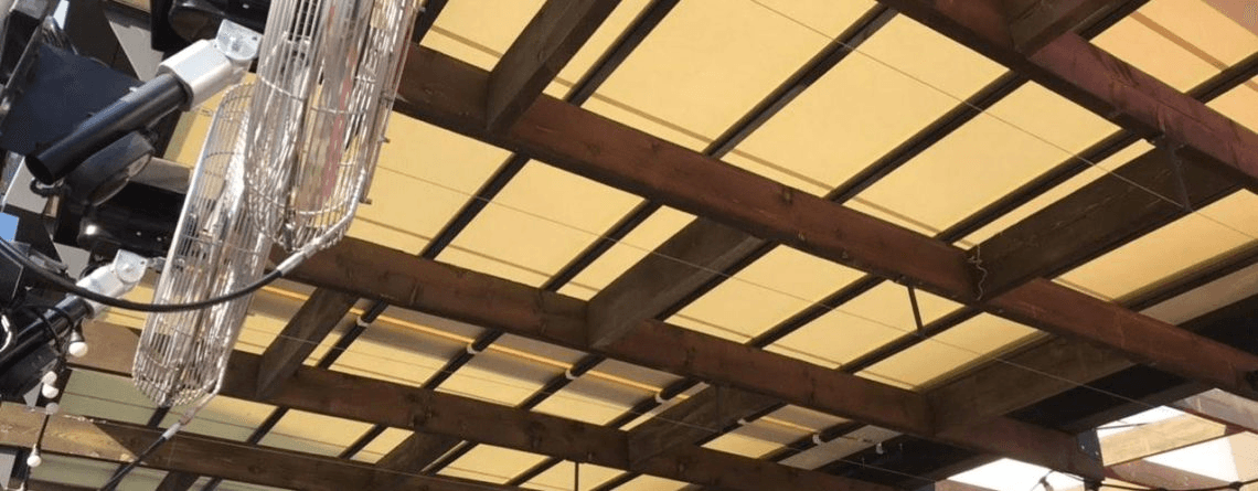Megoldást kellett találnunk a leendő étterem teraszának árnyékolására is. Ennek egy részét szintén visszafogott, de annál hatékonyabb módszerrel oldottuk meg. A meglévő kültéri fémszerkezetre egy 7,81 m x 4,56 m-es felső lefutósínes, motoros mozgatású pergolát telepítettünk. Ennek a modellnek különösen nagy előny, hogy nagy szélállósággal rendelkezik a ponyvával együtt mozgó keresztirányban elhelyezett ponyvamerevítő alumínium profiloknak köszönhetően.
