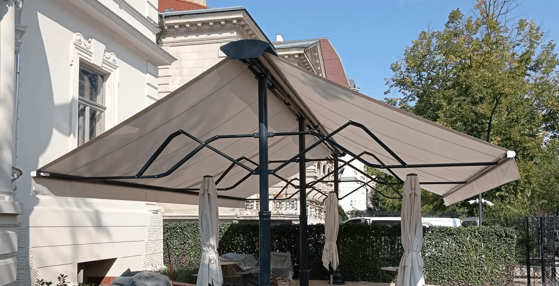 Két oldalra nyíló szerkezeteink nem igényelnek falfelületeket vagy egyéb átalakítást a telepítés helyszínén. A két oldalra nyíló ernyőrendszer kiváló megoldás lehet, ha nem szívesen végezne átalakításokat épületén vagy az engedélyeztetés kapcsán nem jöhet szóba a telepítés helyszínén lévő falfelületek használata.